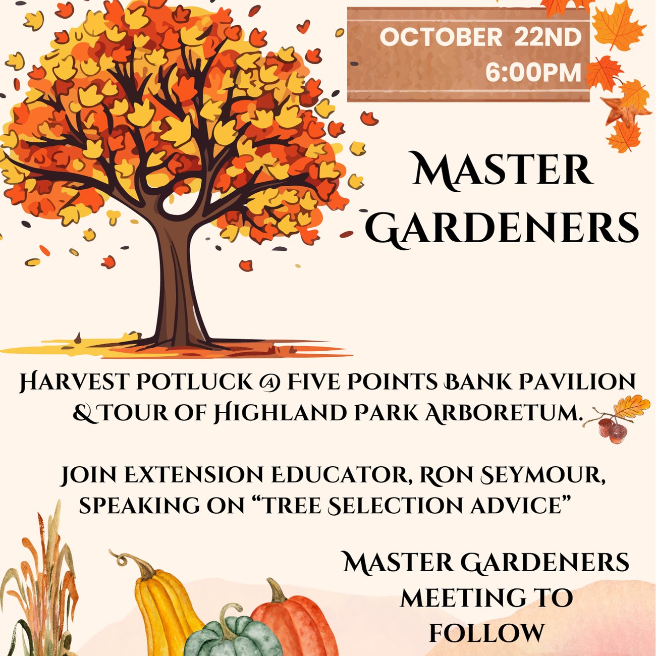 Details: Master Gardeners will be having a Harvest Potluck at Five Points Bank Pavilion and a tour of Highland Park Arboretum. Extension Educator, Ron Seymour, will be speaking on “Tree Selection Advice”. Master Gardener meeting to follow.